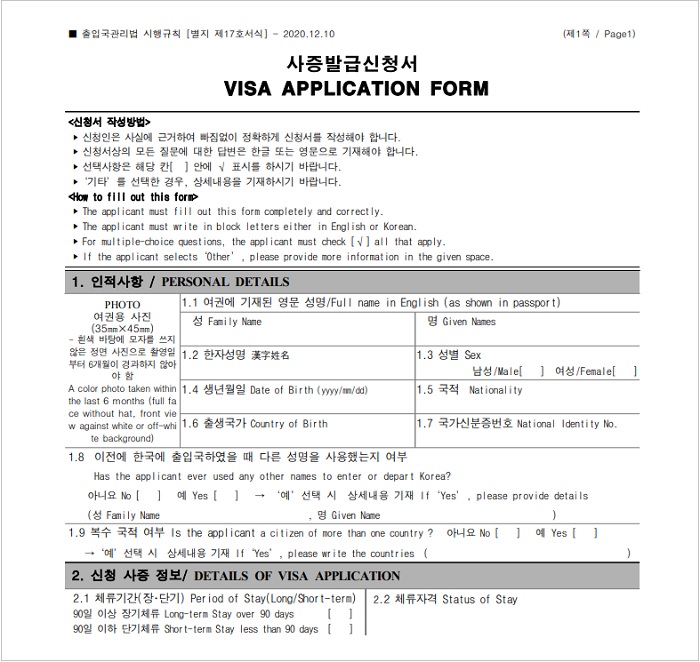 - Mẫu đơn xin visa Hàn Quốc 5 năm